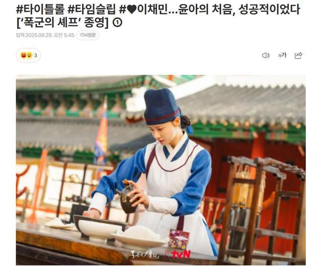 当“少女时代”的林允儿遇上朝鲜时代的“暴君”,一场收视风暴就此引爆。据韩国媒体9月29日报道,刚刚收官的tvN周末剧《暴君的厨师》,不仅让林允儿首度担纲电视剧标题角色,更以“时间穿越+年下恋”的奇幻设定,让她稳稳接住了这波流量——或者说,她本人就成了流量本身。