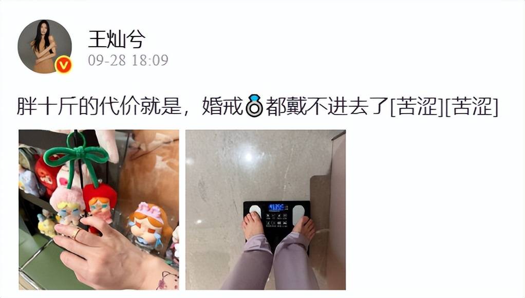 胖了的王灿还发文:胖十斤的代价就是,婚戒都戴不进去了,王灿是不知道该笑还是该哭了,毕竟身材太瘦身体不好,但胖了之后也挺苦恼,估计之前的很多衣服都穿不进去,这婚戒都戴不上去要换新的了,也有可能是在提示老公买新的了,哈哈~