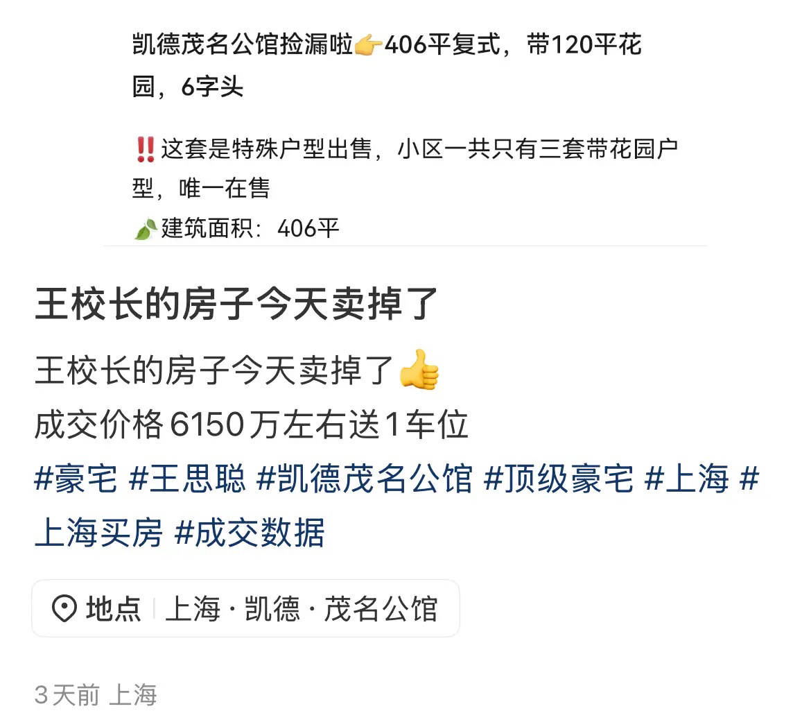 王思聪在上海的豪宅,也在同一天卖出去了。这一天王思聪家里的事情都赶在一起了,父亲限高、又被取消,此前自己公司被强执1210万,可他上海的一处豪宅就卖了6150万。