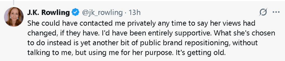 9月30日,罗琳发长文回应了艾玛·沃特森早前对自己的示好,在回复评论时再次抨击艾玛沃特森:“如果她的观点真的改变了,她随时都可以私下联系我,告诉我,我会全力支持。但她现在的做法,只是又一次公开重塑个人形象,既不与我沟通,却又利用我来达到她的目的。这种把戏真够老套的。”