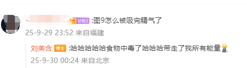 9月30日,刘美含在社交媒体平台发布了一组美照,有一张照片是坐在轮椅上,有网友在评论区称:“图9怎么被吸完精气了”,刘美含回复:“哈哈哈哈哈食物中毒了哈哈哈带走了我所有能量”。