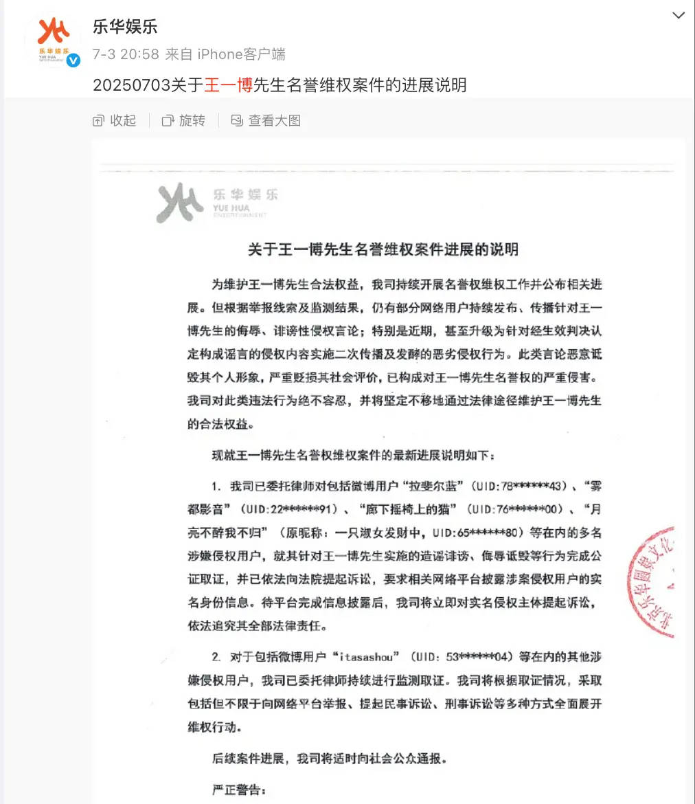 企查查APP显示,9月30日,法院向周某某送达王一博与其网络侵权责任纠纷起诉状副本及开庭传票等,定于2025年11月17日在北京互联网法院开庭审理。今年7月,乐华娱乐公布王一博名誉维权案件的进展说明,称根据举报线索及监测结果,仍有部分网络用户持续发布、传播针对王一博先生的侮辱、诽谤性侵权言论,将坚定不移地通过法律途径维护王一博先生的合法权益。