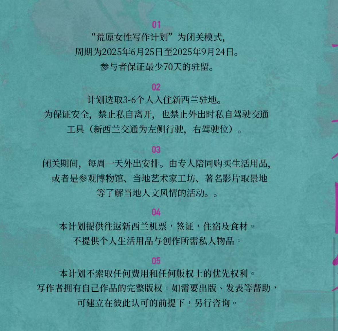 她在今年三月发起了“荒原女性写作计划”。这是一场为期三个月女性闭关写作计划,为女性提供一座位于新西兰的别墅作为写作场所,导演本人支付往返新西兰的机票签证餐食等费用,入选者则需要交5万人民币的押金。