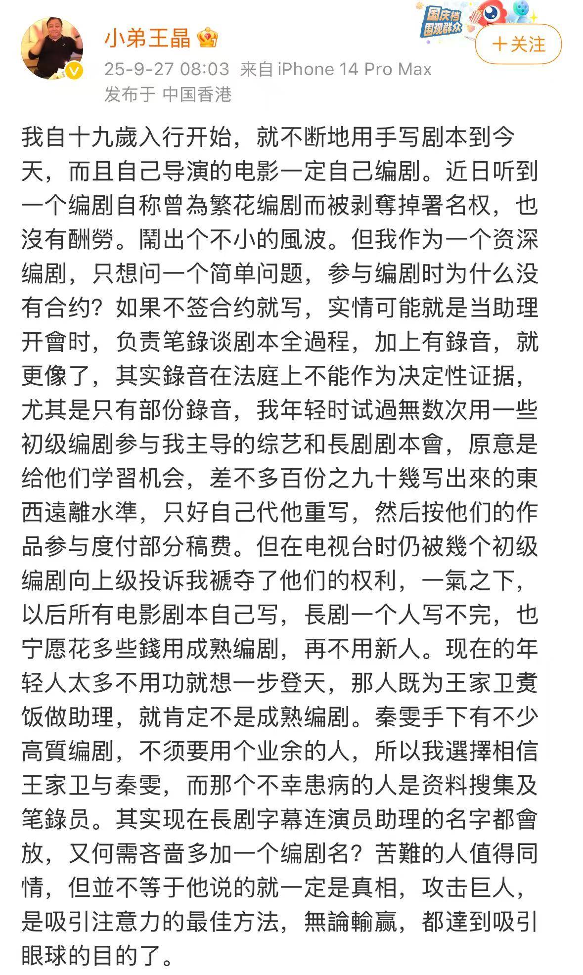 反倒是王晶、鲍德熹等知名业内人士发文支持王家卫——王晶表示自己相信王家卫和秦雯,录音在法庭上无法作为证据;鲍德熹则表示是否有编剧署名需要看合同里规定的职务。