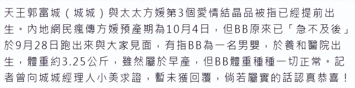 此前,有媒体根据她的身形和活动安排推测,预产期大约在10月初。谁料在9月30日,港媒突然放出消息称:方媛已于9月28日提前顺利产下一名男婴,体重6.5斤。
