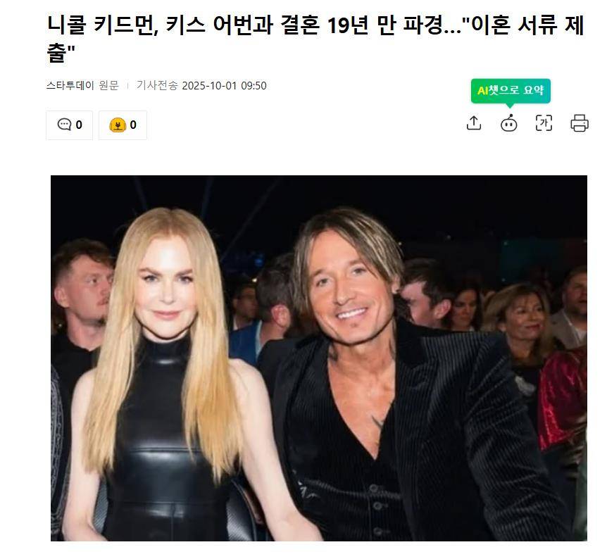 据韩国媒体10月1日报道,好莱坞影后妮可·基德曼与乡村歌手凯斯·厄本长达19年的婚姻,这次看来是真的走到了尽头。距离两人分居消息曝光仅一天,美国娱乐媒体TMZ在今天就爆出猛料:基德曼已正式向田纳西州纳什维尔法院提交离婚文件,为这段曾被视作“娱乐圈清流”的婚姻画上了句号。