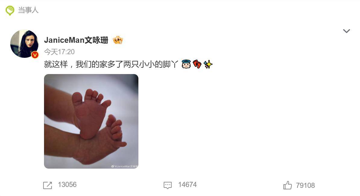 9月30日,文咏珊在个人微博突然扔出一则“重磅消息”——晒出一张婴儿小脚丫照片,配文“就这样,我们的家多了两只小小的脚丫”,正式官宣升级当妈。这一操作瞬间引爆热搜,网友纷纷惊呼:“什么时候结的婚?怎么突然就当妈了?”