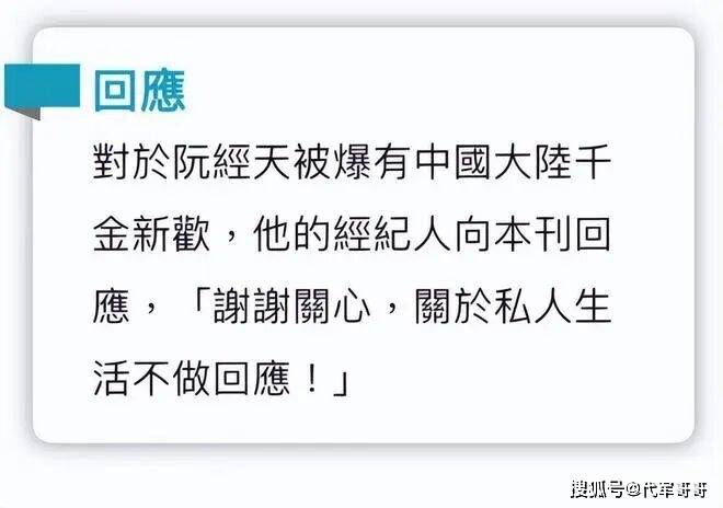 面对台媒的爆料,阮经天的经纪人在接受媒体询问时,选择了沉默。既没有承认这段恋情的真实性,也没有明确否认,只是回应 “谢谢关心,关于私人生活不做回应!” 这种模棱两可的态度,无疑让这段恋情更加扑朔迷离。