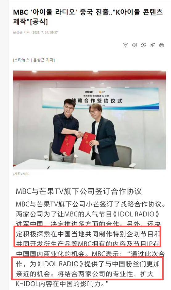 芒果TV旗下公司曾和韩国电视台MBC签过一个战略合作协议,说法很不对味,提到要扩大韩流在中国的影响力、还用了进军中国这种很有歧义的词。