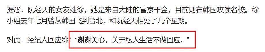 阮经天新恋情的消息一经传出,迅速登上热搜榜首,网友们纷纷热议。不过面对这波热搜,阮经天本人没有回应,反而是他的经纪人出面发声,称 “谢谢关心,关于私人生活不做回应”,网友们大多将此解读为默认恋情。