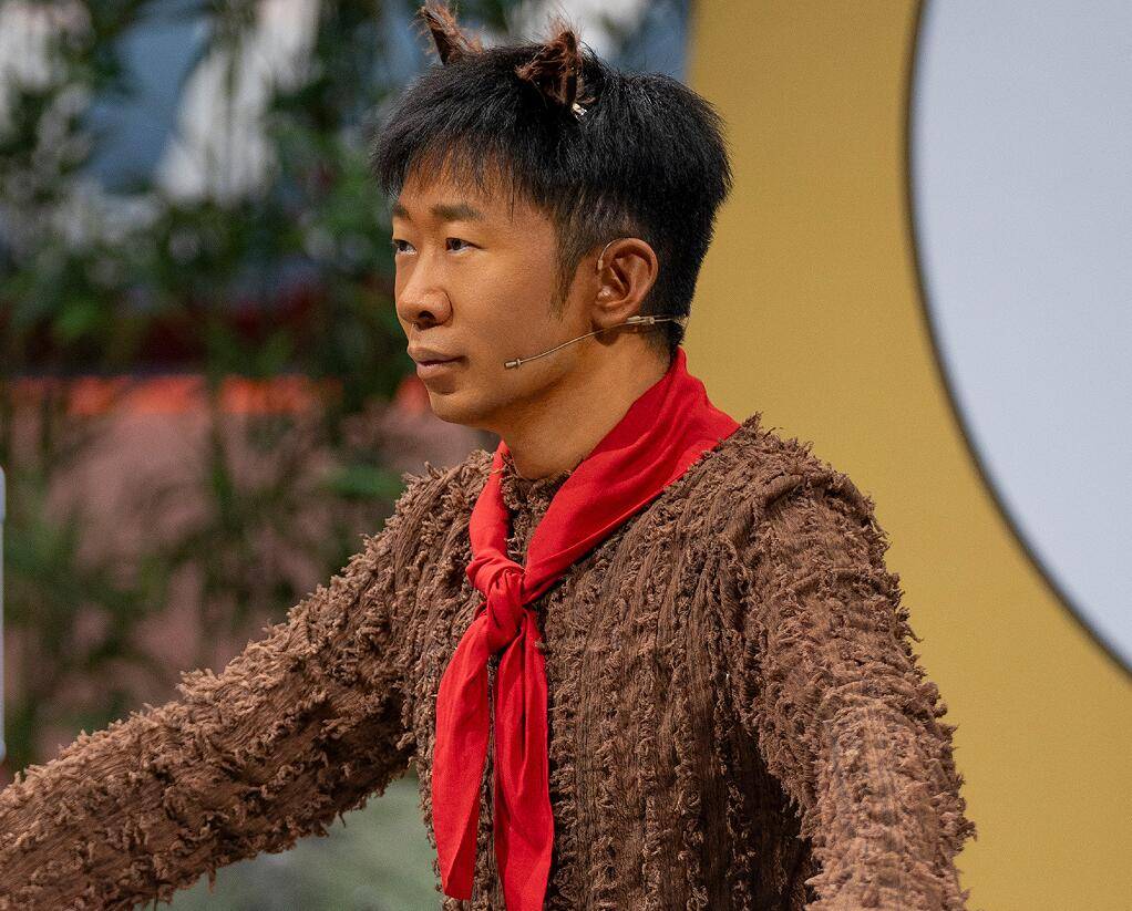 每轮会先派出一个人来猜题,然后两个人负责表演,猜题人左右手边各有一个题板,一个状态和一个人物,比如说在主持的沈涛,你们要表演把这个组合词一起表达出来,然后要猜出来,一旦猜错了就可以拿手里的水枪滋他。
