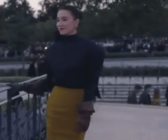 当晚她去看YSL大秀,上半身是一件黑色的丝质衬衫,料子在夜里的灯光下泛着高级的光泽感。