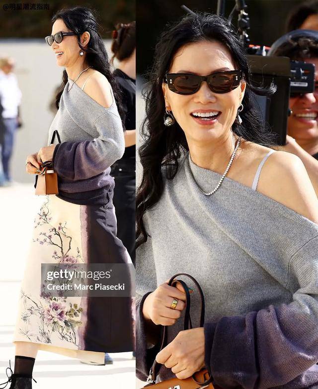 迪奥给她的待遇也很好,她虽然不是明星,但是穿得是超季节礼服,一身渐变色露肩针织上衣,搭配印花半身裙,黑色短靴,戴着墨镜,极具东方韵味,尽显东方美。