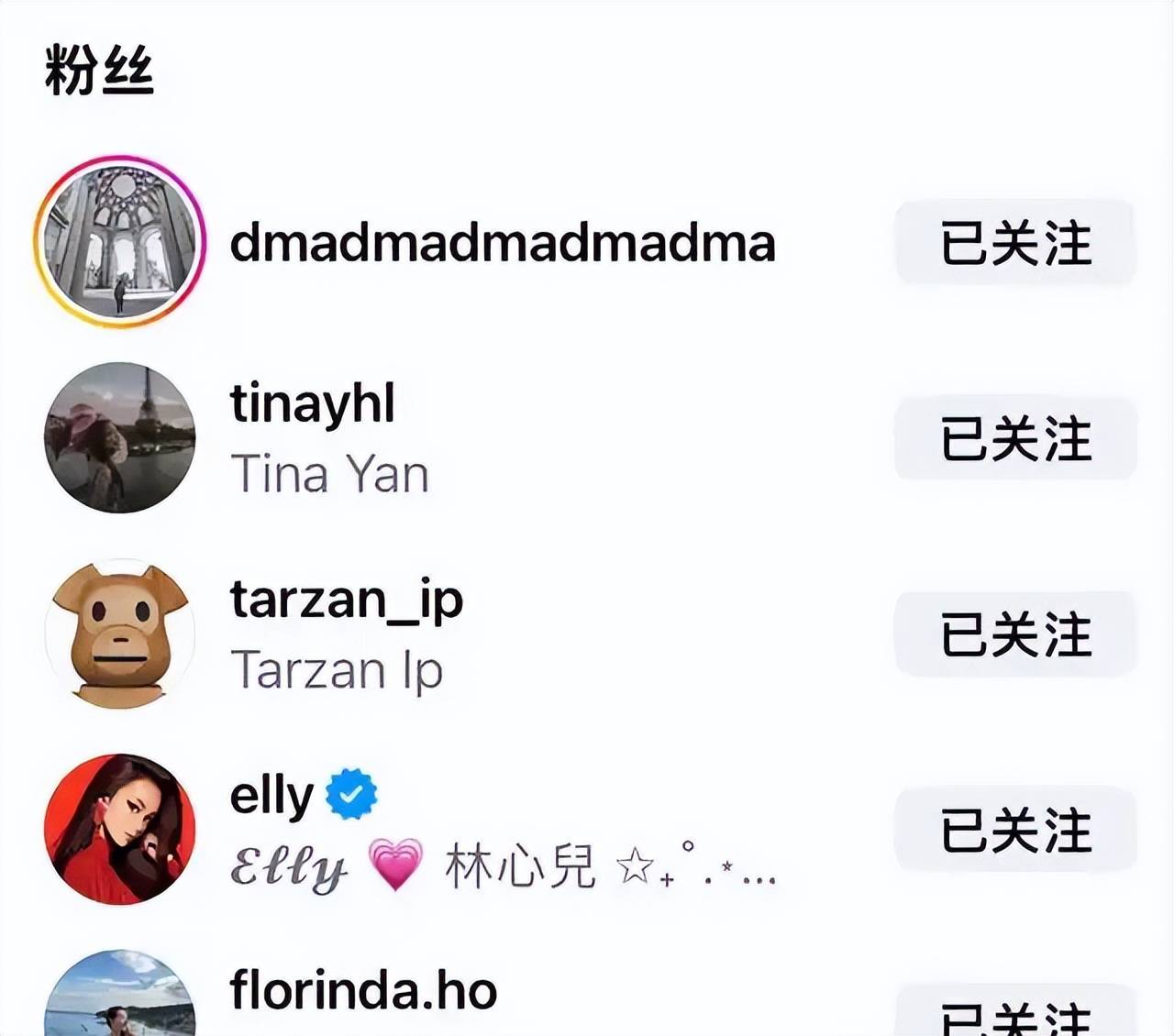 Fiona的身份曝光后,网友发现她的社交账号已获得何猷启姐姐何超莲、何超云的关注,香港名媛林心儿也在其粉丝列表中。