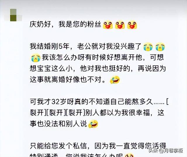 之前在《庆奶的客厅》访谈里,有粉丝吐槽自己32岁遭遇无性婚姻,舍不得孩子又熬得难受,问她该怎么办。