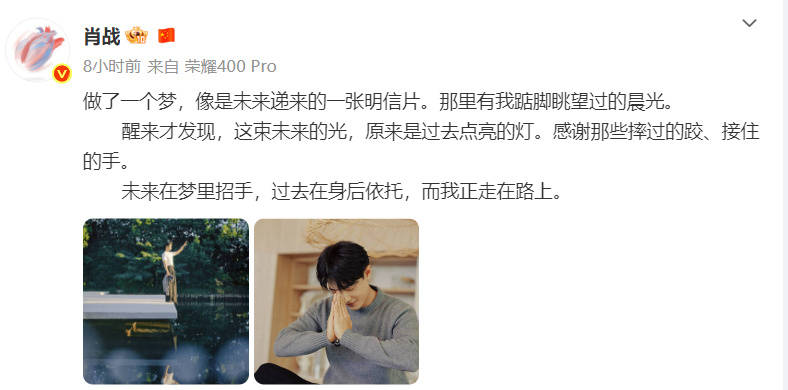 10月5日,是肖战34岁生日,他在社交媒体平台上发文,“做了一个梦,像是未来递来的一张明信片。那里有我踮脚眺望过的晨光。醒来才发现,这束未来的光,原来是过去点亮的灯。感谢那些摔过的跤、接住的手。未来在梦里招手,过去在身后依托,而我正走在路上”。