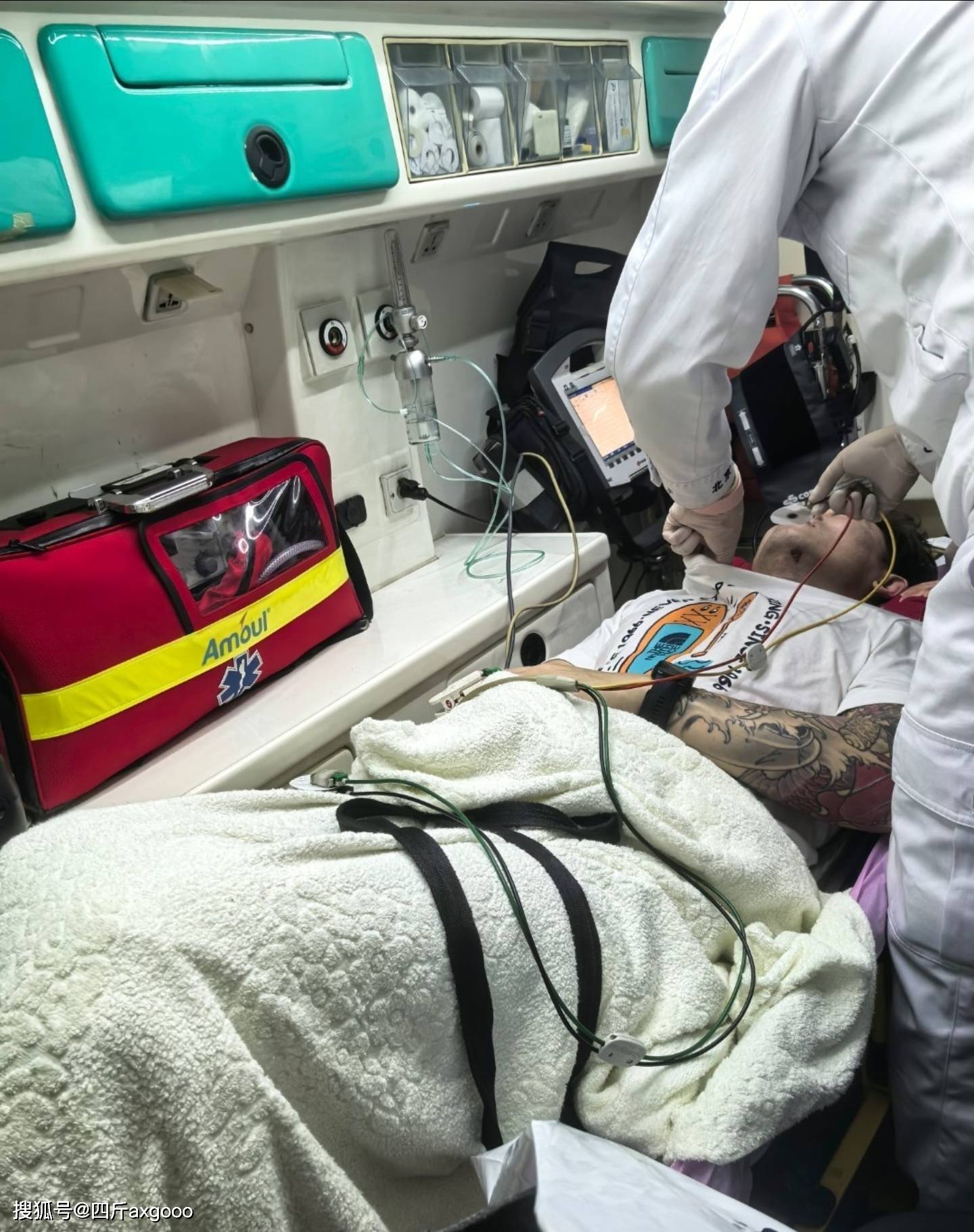 看家属分享的照片,能看到一个胳膊上有图案的白衣服男子躺在救护车上,胸口上有设备,口鼻里有吸氧器。