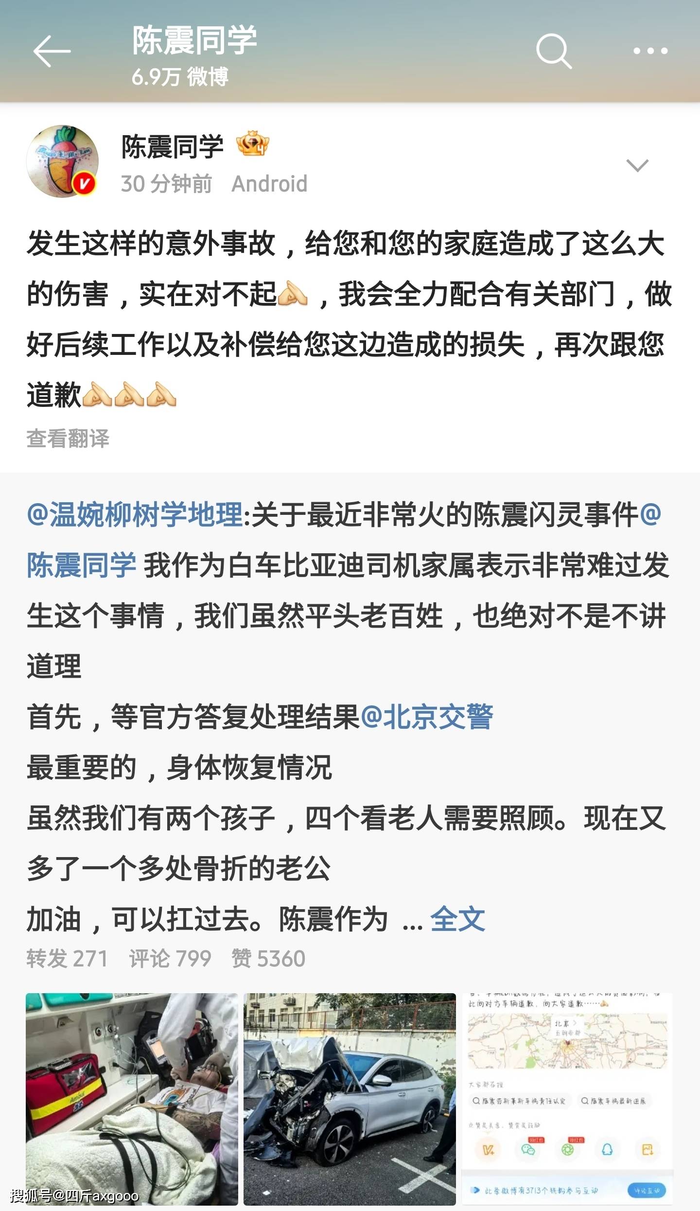 在家属发文后,陈震自己也转发了,说发生这样的意外事故,给她和她的家庭造成了这么大的伤害,实在对不起。