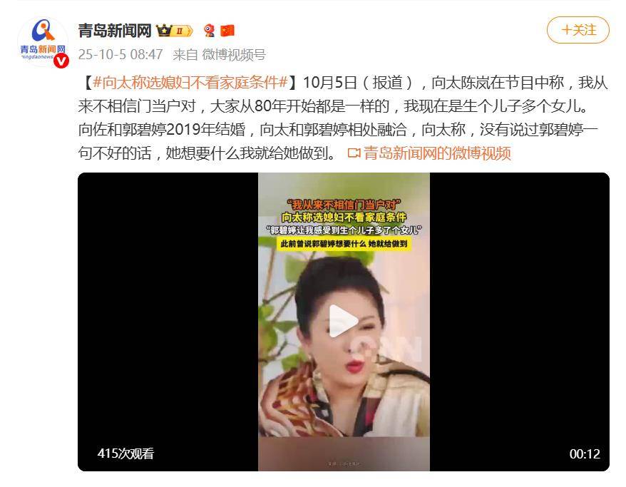 据10月5日报道,向太陈岚最近在直播里一句“我从来不相信门当户对”,直接掀翻了豪门婚恋的“祖传剧本”。她坦言,自己和郭碧婷的缘分,从一开始就跳出了“家世匹配”的框架,更像是“生个儿子,多了个女儿”的命中注定。