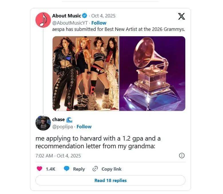 在X平台(原推特)上,舆论迅速两极分化。不少人翻出aespa年初在《早安美国》的表演争议,质疑其现场实力“能否撑起格莱美门槛”;更有批评直指SM“不切实际”,认为强推奖项反而让成员陷入不必要的压力。