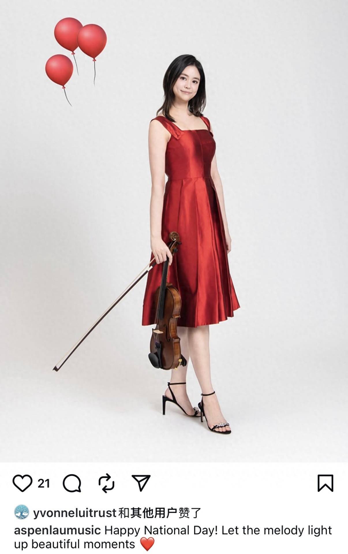 香港的国庆节只有一天的假期,所以刘秀盈自曝就留在香港,哪里都不去。虽然不外出,但是她还是要以自己的方式庆祝国庆,于是就晒出了一张个人近照。照片中刘秀盈罕见地穿上了一身红色的吊带长裙,这条裙子的面料有光泽,看起来像礼裙,很高级也很隆重尽显大气。裙子的剪裁很好,完全以刘秀盈的身材贴身设计,尤其是腰身比例特别好。刘秀盈手拿小提琴,举止优雅,穿上了高跟鞋,显得成熟、大方,展现出的是与以往邻家少女截然不同的气质与面貌。