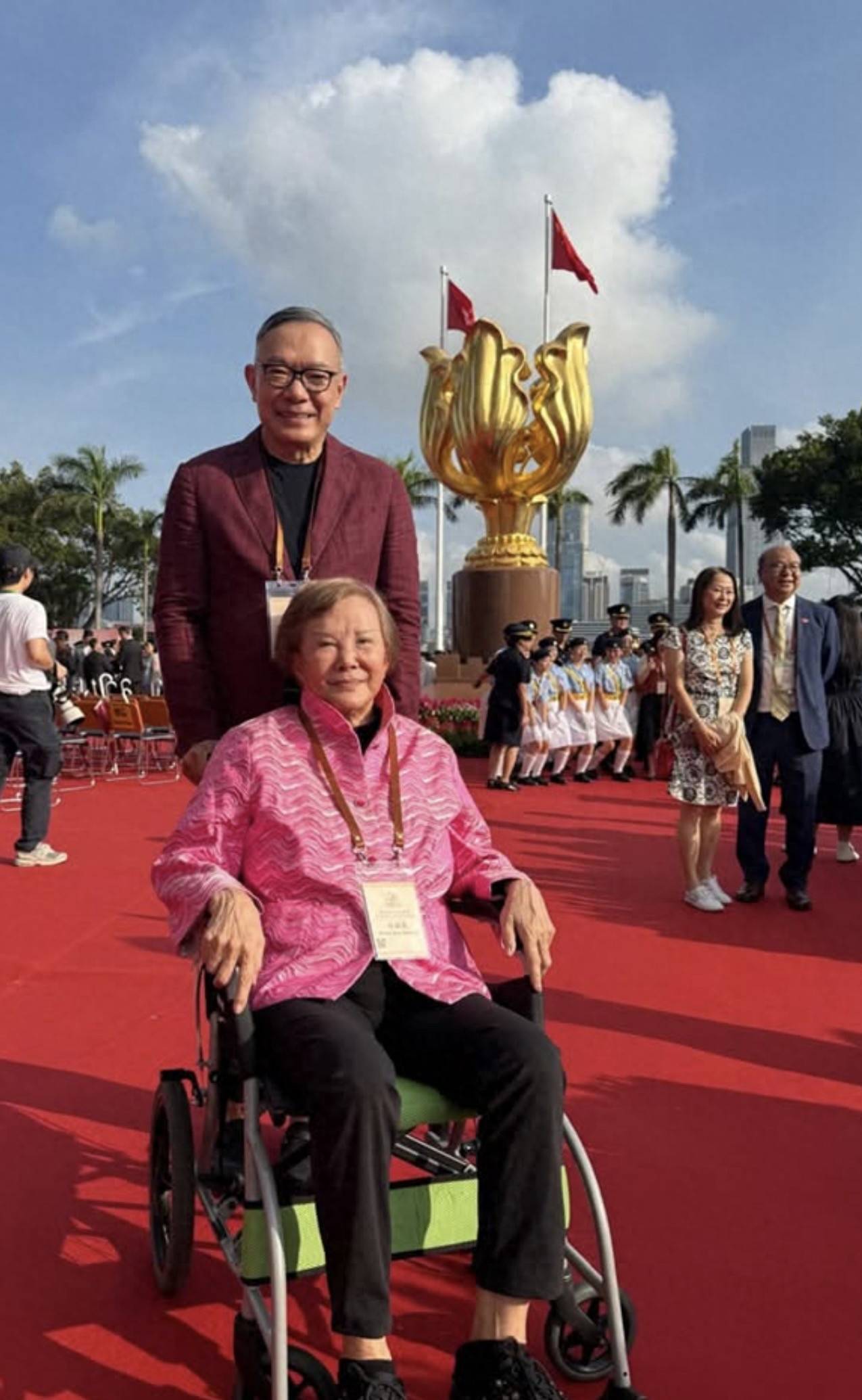 国庆节这一天,香港各界举办了隆重盛大的庆祝仪式,其中特区政府就在金紫荆广场就举办了升国旗仪式,出席的人士除了政府官员,香港各界人士都有代表参加,很多名人、名流都在现场,大家都盛装出席,以示隆重。汪明荃、邝美云都在升旗仪式现场露脸,她们不约而同地穿上了红色的衣服,喜庆而抢眼。罕见的是,已经81岁的白韵琴也在小15岁丈夫的陪伴下也现身广场,参加升旗仪式。