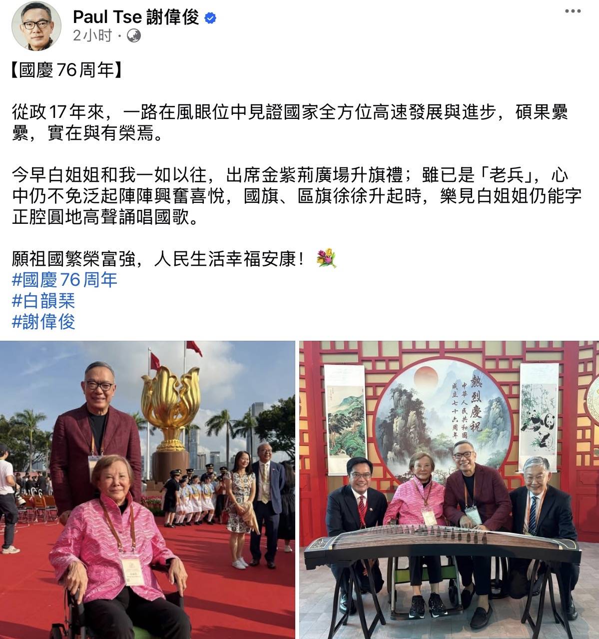 谢伟俊陪着白韵琴参加了升旗仪式后,感慨留言,他称从政已经17年了,一路见证了国家的全方位高速的发展与进步,自己感到骄傲与自豪。而每年国庆,他都会带着白姐姐到金紫荆广场参加升旗礼,他笑称虽然年年来,已经算得上是“老兵”了,但是心中仍不免有兴奋与喜悦之情。而当看着国旗、区旗徐徐升起的时候,他更显得激动。而最让他乐见的是身边的白姐姐,在国歌响起的时候,仍然能字正腔圆地高声颂唱国歌,不得不说夫妻俩皆有很深的爱国情怀。