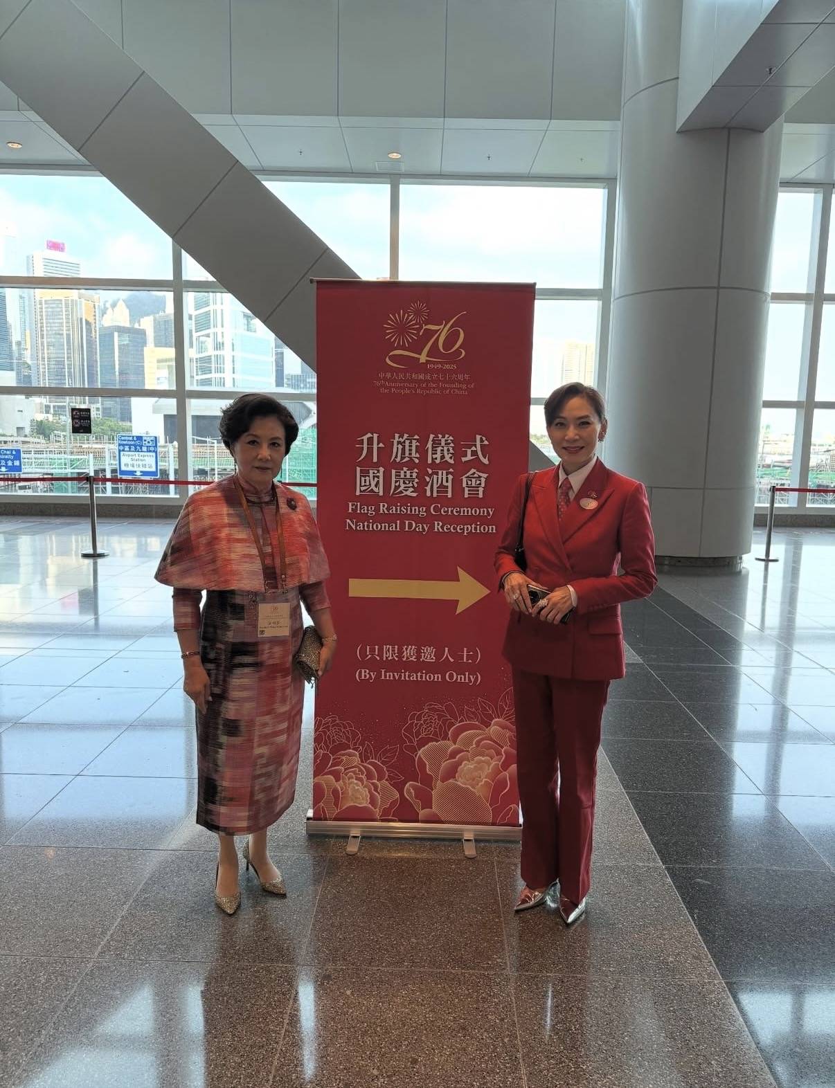 除了参加升国旗仪式之外,谢伟俊还带着白韵琴参加了国庆酒会——升旗仪式结束之后,特区政府惯例还会举办酒会等招待活动。在酒会现场,不少名人都现身了,比如汪明荃,当天她也是盛装出席,穿了一身粉色的新中式,拎了一个金色的包包,显得很贵气。同场的还有邝美云,她是一如既往地以西装现身,当天她穿了大红色的西装,系了大红色的的领带,真是从头红到脚,整个人可谓英姿飒爽,精神抖擞。