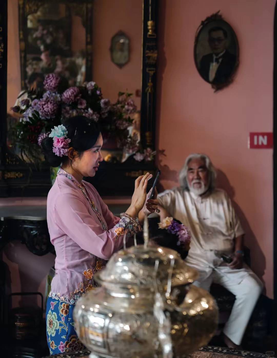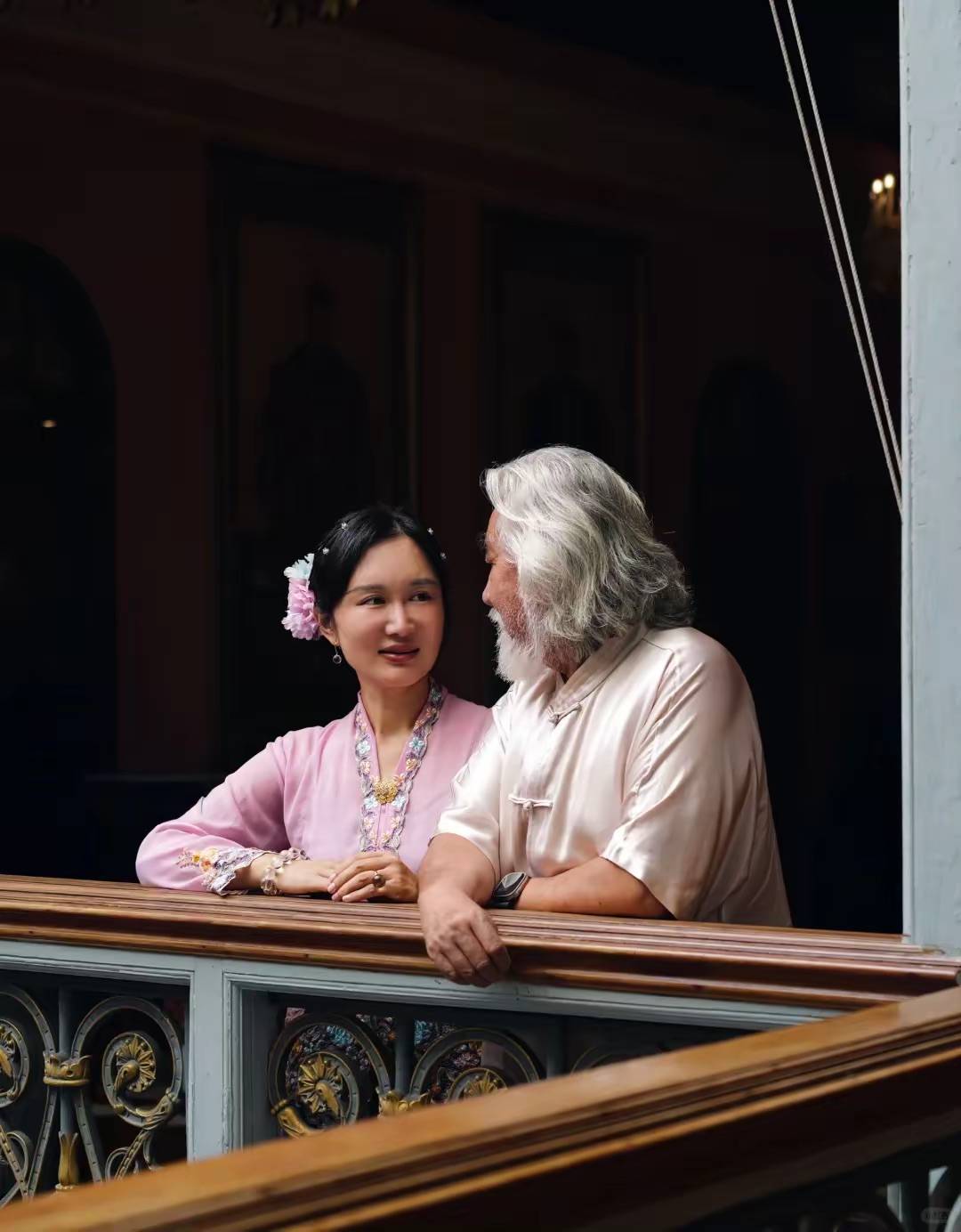大概是为了出片,张纪中也会陪着老婆拍照。他们有专业的摄影师跟拍,也有专业的道服化,杜星霖穿着娘惹服饰、做了簪花的造型,端庄贵气。