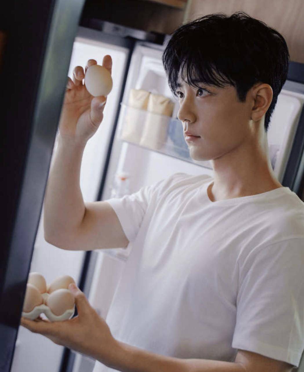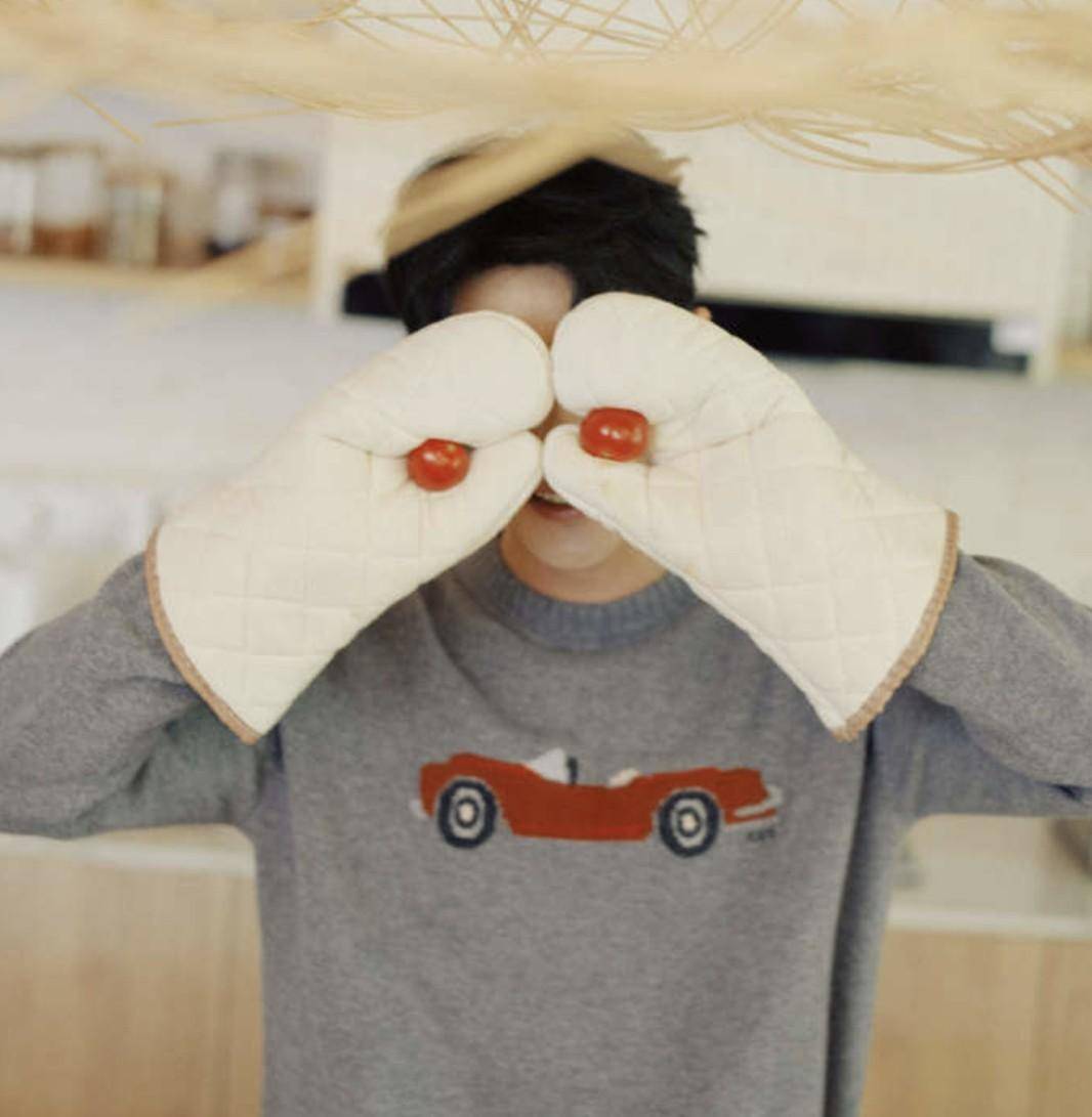 TODS那套烘焙look,官网价不便宜,可穿他身上就像楼下超市随手买的,袖子撸到手肘,面粉沾了一点,瞬间没距离感。