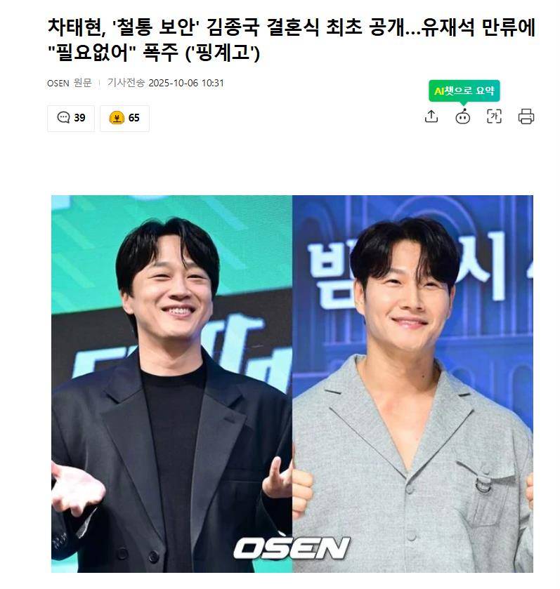 挚友的婚礼能有多“双标”?车太贤最近就用实际行动演绎了一场“兄弟情深的翻车现场”。据韩国媒体10月6日报道,在最新一期节目中,他不仅自曝在金钟国严密安保的婚礼上偷拍,还对着刘在石的劝阻甩出一句“没必要操心”,笑翻全场的同时,也让人感慨:这哥是真敢说!