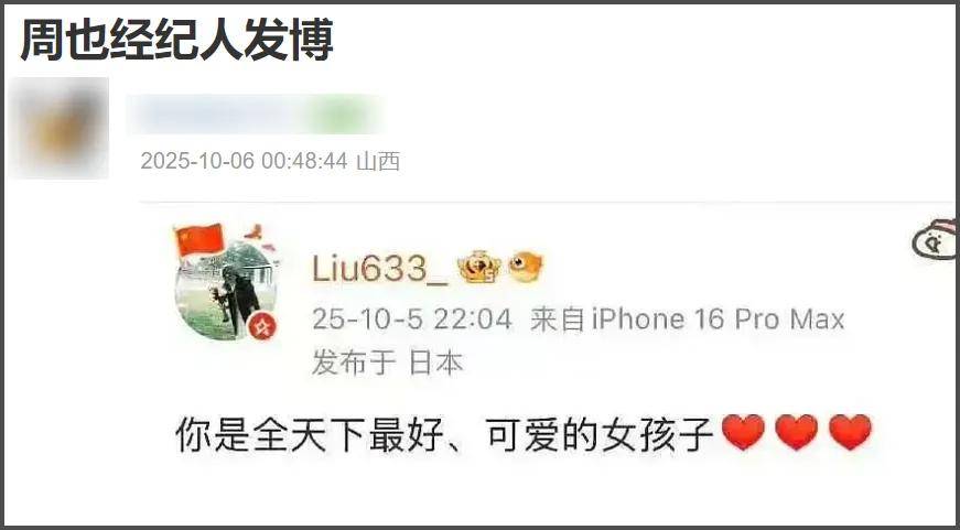 甚至有网友开始模仿李湘live图里的语气,说“我也不喜欢周也”,此前李湘误发live图,背景音有人说“我不喜欢周也”,引起网友热议,随后周也经纪人还疑似发文回应,称“你是全天下最好、可爱的女孩子”。