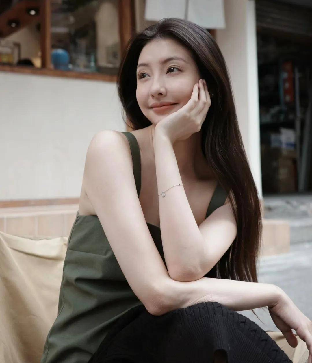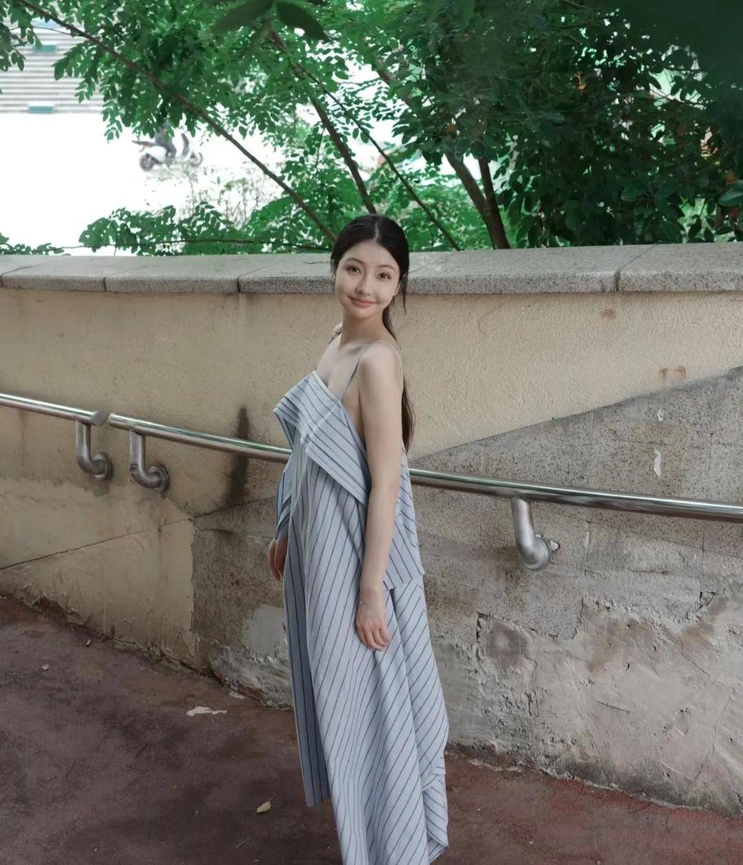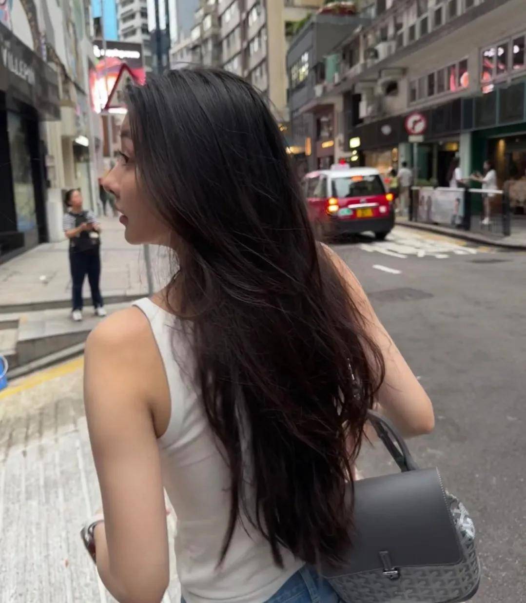值得注意的是,她的头发又黑又直,长到腰的位置了,估计是留了好长时间呢。