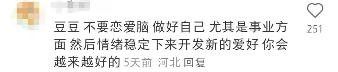 评论区里,有网友劝她不要恋爱脑,做好自己,尤其是事业方面,然后情绪稳定下来开发新的爱好。