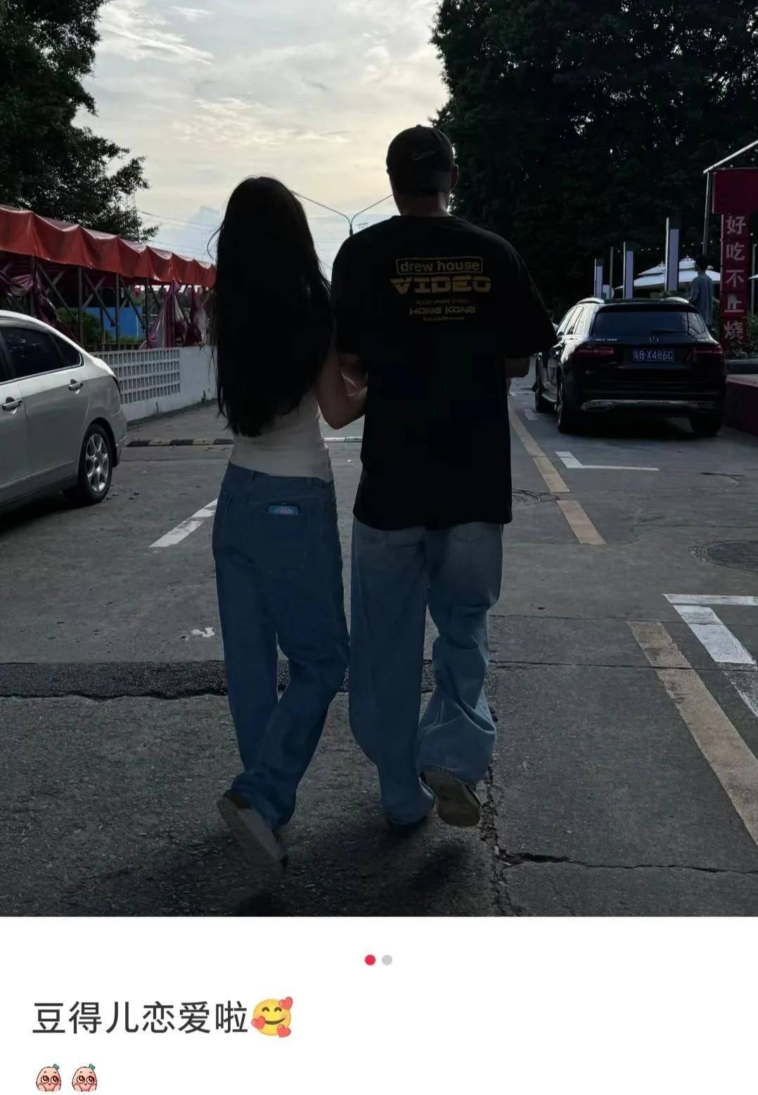 她的男友头戴黑色帽子,上穿条纹衫,下搭牛仔裤,个子看起来很高大。值得注意的是,这次她男朋友罕见露出了侧脸,看起来很帅气。