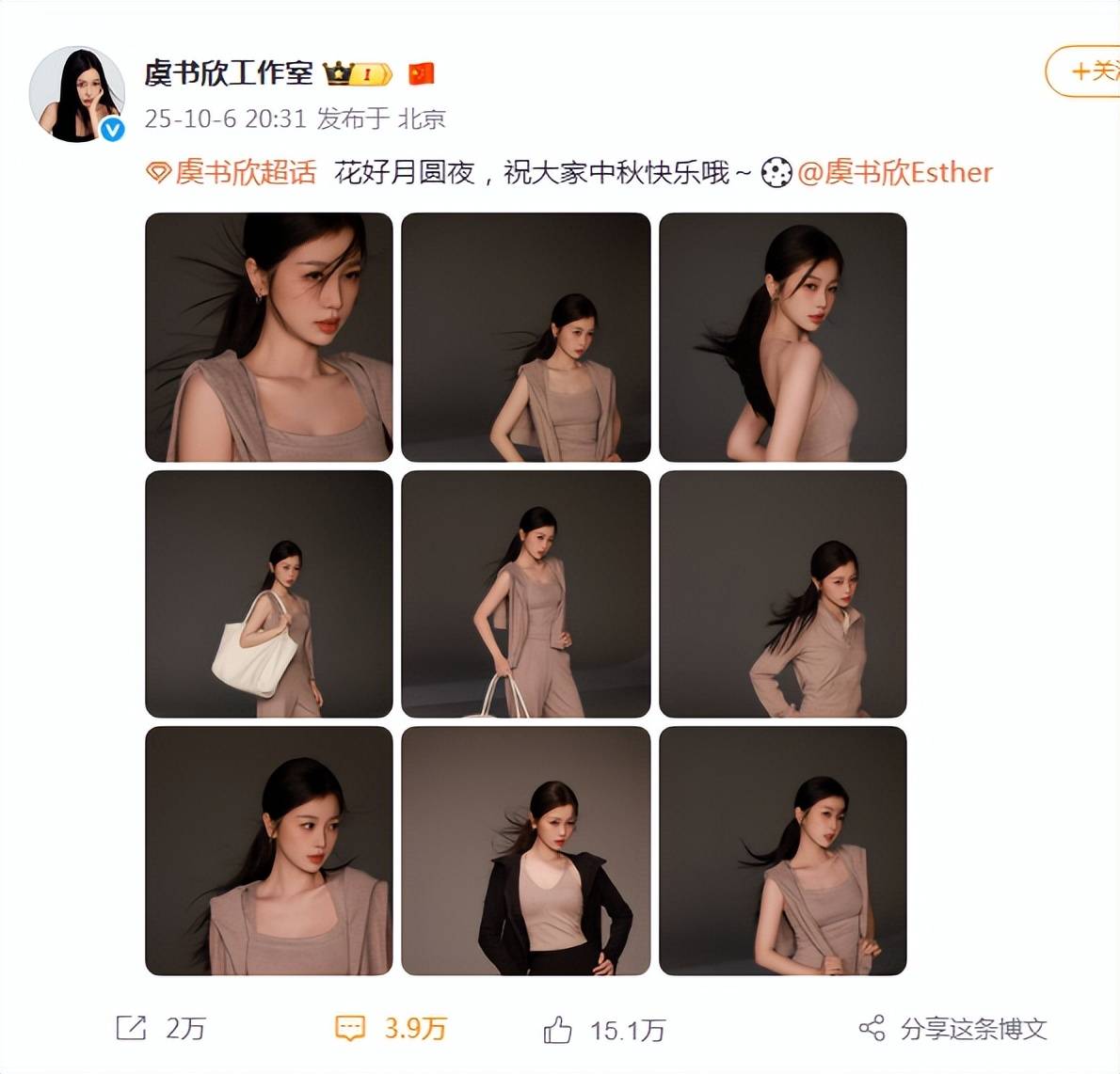 2025年10月6日中秋节,虞书欣工作室通过微博发布节日问候“花好月圆夜,祝大家中秋快乐哦~”,并关联虞书欣个人账号。