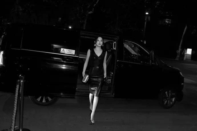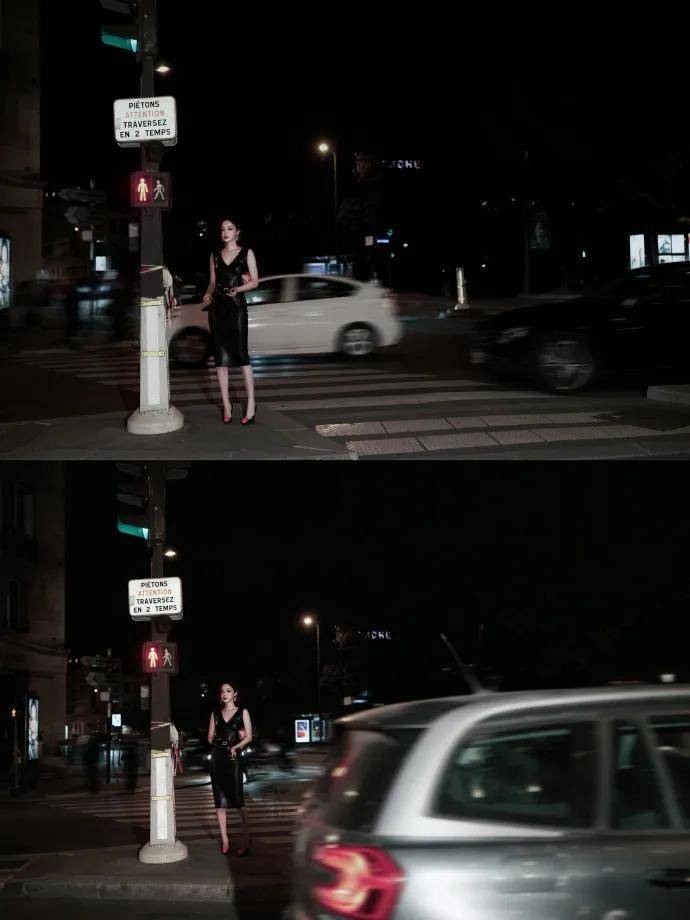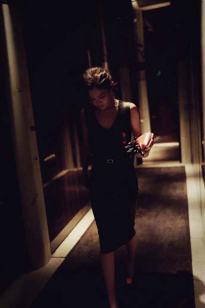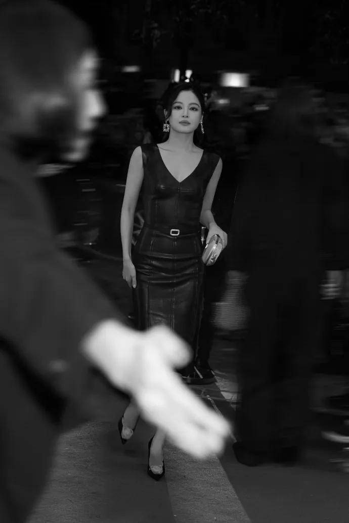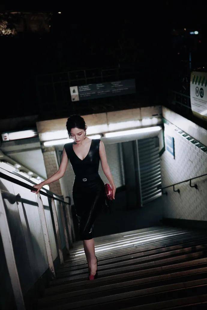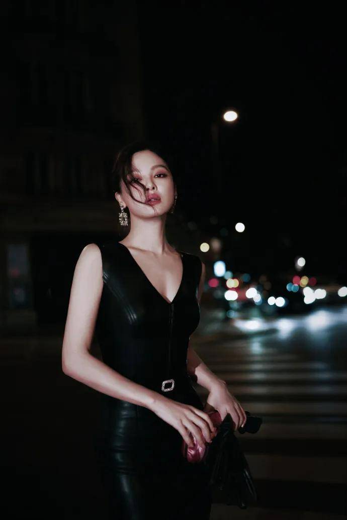 照片中,辛芷蕾身着黑色皮裙站在深夜的巴黎街头上,在灯光中显得神秘又性感,哪怕是黑白照片,都显得她性感火辣。
