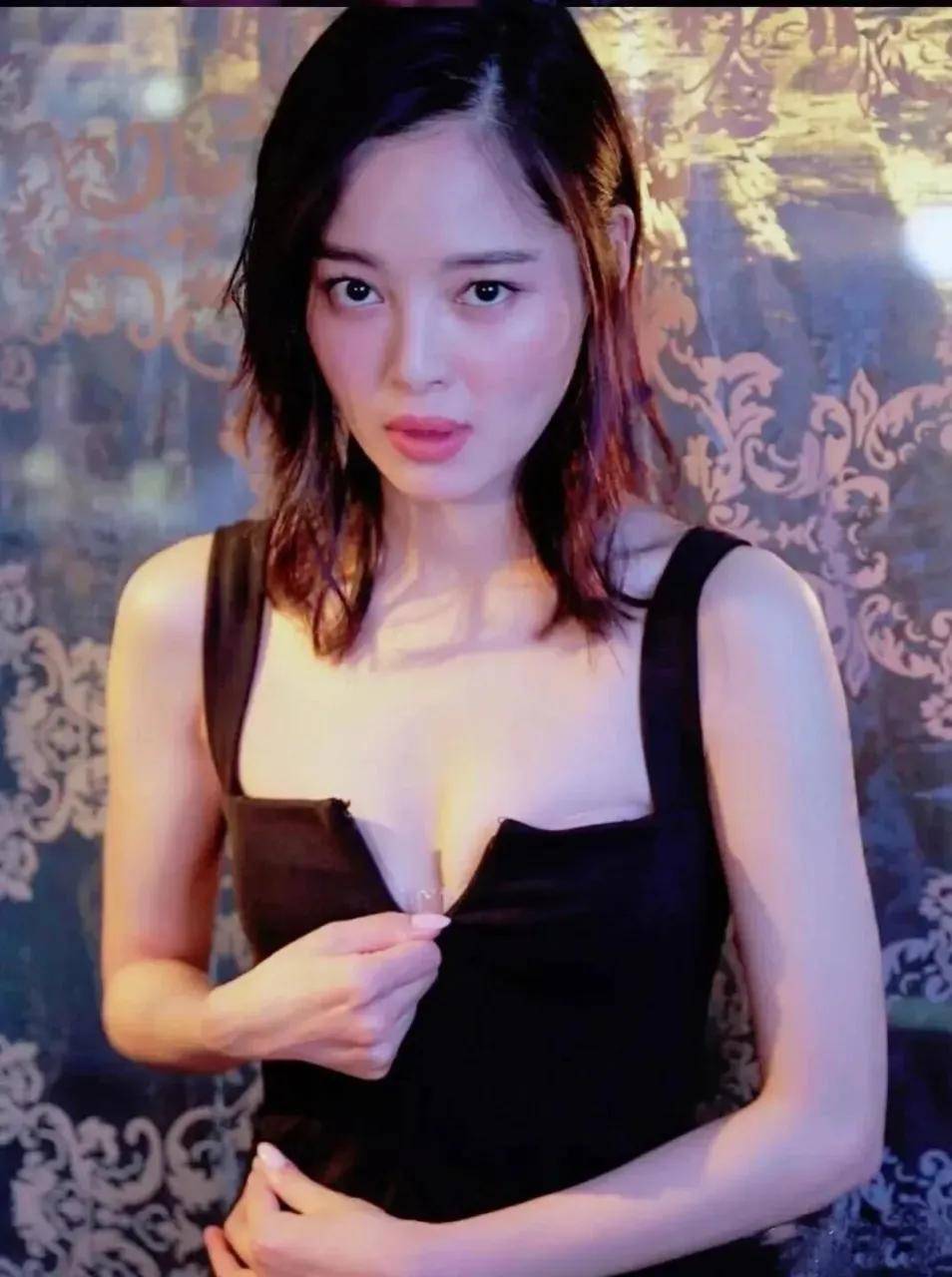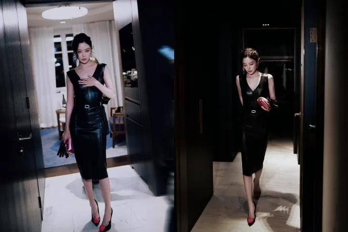 辛芷蕾身着黑色吊带皮裙,她俏脸成熟妩媚,五官精致,长发盘起,露出白皙的香肩和傲人的事业线,大秀曼妙的身材曲线,绝对性感撩人!