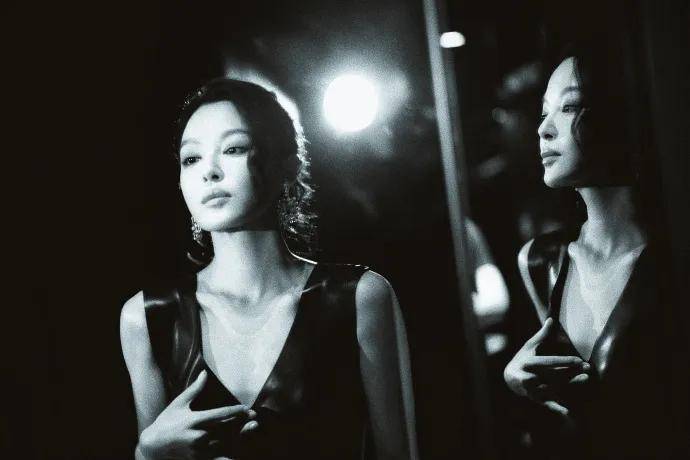 辛芷蕾身着黑色吊带皮裙,她俏脸成熟妩媚,五官精致,长发盘起,露出白皙的香肩和傲人的事业线,哪怕是黑白照片的写真,都显得性感撩人!