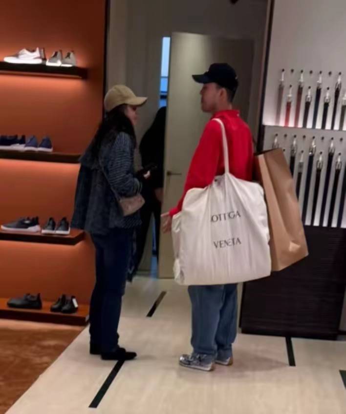 跟在郭晶晶身旁的,是一位穿着红色上衣的男士。这位男士帮郭晶晶提着她的战利品,郭晶晶正在和店员核对小票。