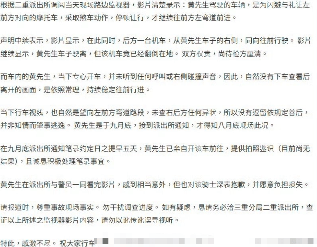 据相关媒体报道,黄子佼涉嫌肇事逃逸接受调查,随后透过律师发声明:“当下专心开车,并未听到任何呼叫或右侧碰撞声音,因此,自然没有下车查看后离开的画面,是依照常理,持续稳定往前行进”、“对该骑士深表抱歉,并愿意负担损失”。