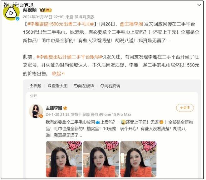 之后李湘否认 “出售二手毛巾”,强调全部是全新物品!是10元购的抽奖品!