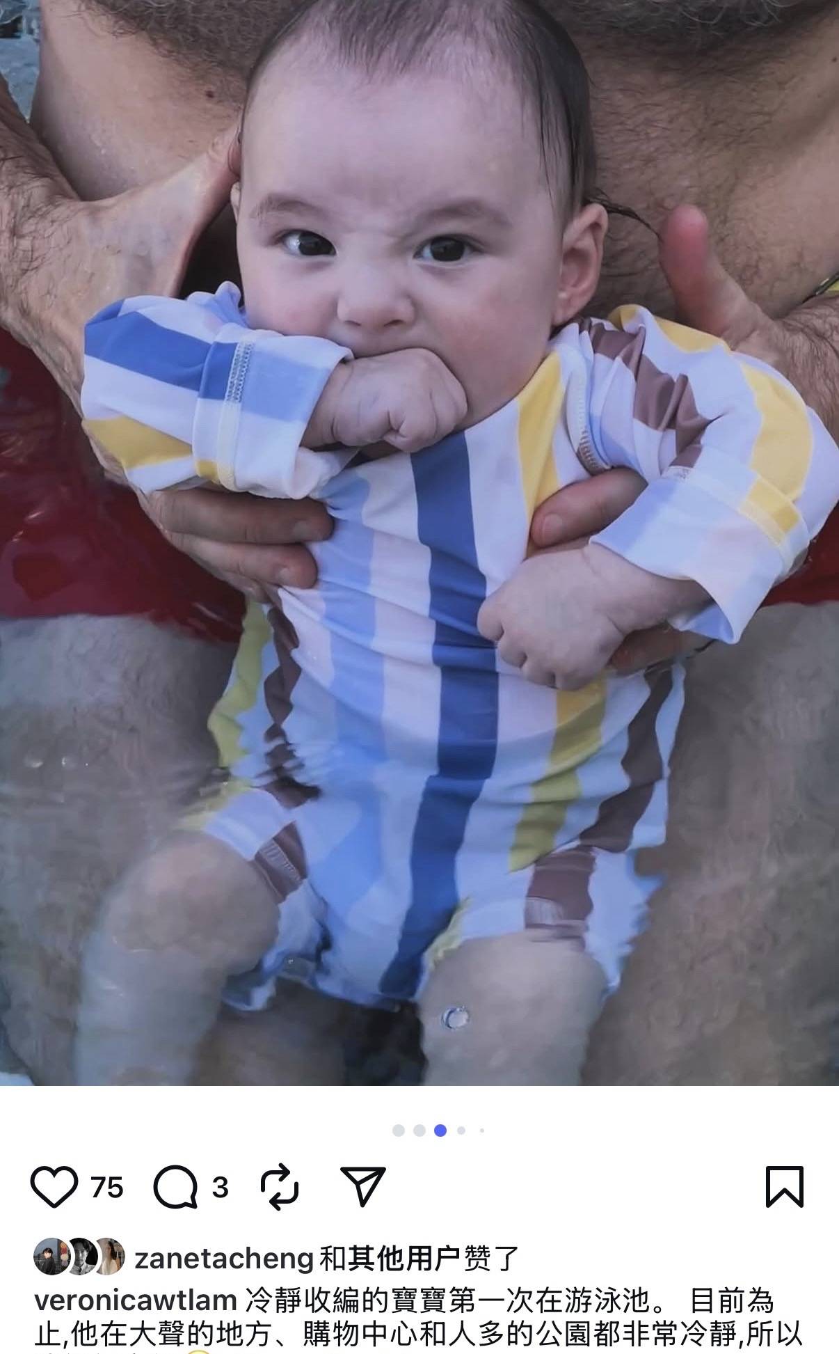 林炜珽的二宝已经满百日了,也到了可以下水玩耍的时候了,林炜珽与丈夫就带着儿子到专婴儿专属泳池游泳去初体验游水的乐趣。林炜珽的小儿子虽然才出生几个月,但是长得非常可爱,才出生的时候还看不出他长得像谁,如今样子长开了,眼睛大大的,发现他长得与父亲很像,看起来很像外国人。二宝很乖巧,第一次下水,不哭不闹,显得很冷静,就连林炜珽也很惊讶。林炜珽透露儿子一直很乖巧,不只是下水不哭不闹,去购物中心、公园也如此,所以夫妻俩都很爱他。
