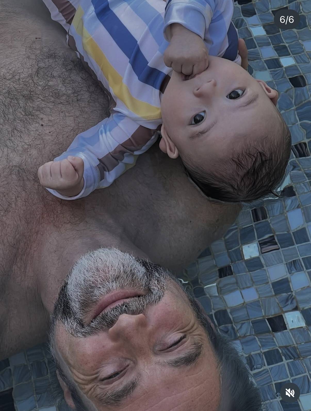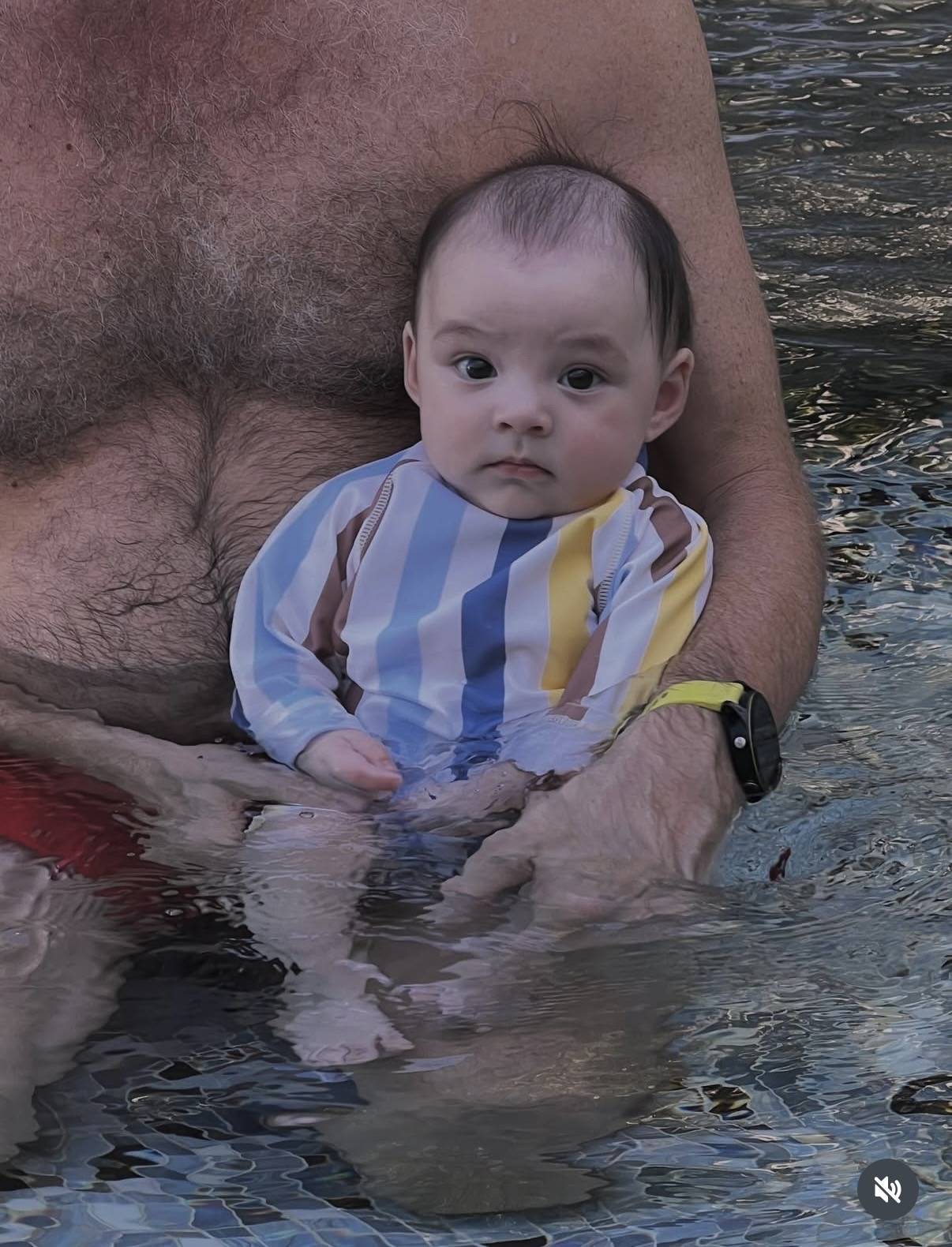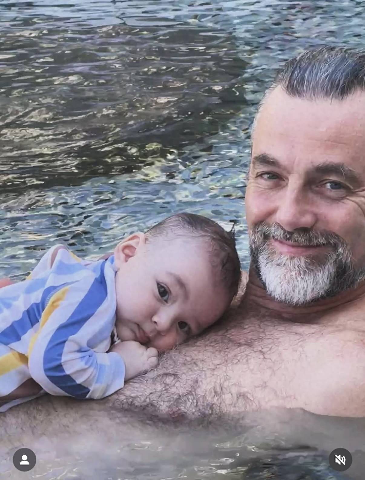 林炜珽公开了多张丈夫与儿子在水中互动的照片,这些照片都相当温馨,其中一张是小儿子趴在父亲胸前的照片。照片中父子俩望着镜头,相当有爱。林炜珽的小儿子眼光温柔,天真无邪,丈夫的眼神充满了慈爱,就是父慈子孝的画面感。林炜珽的丈夫是外国人,身上的毛发茂密,胸前都是毛发,而且胡子、头发都已经花白了,毕竟也年过半百了。虽然他看起来略显苍老,散发出成熟的气质,但是给人的感觉还是帅气且慈祥的。而百日的儿子在他的怀抱中,父子同框是有点爷孙儿的味道,不过夫妻恩爱,一家幸福,这也不是什么问题。