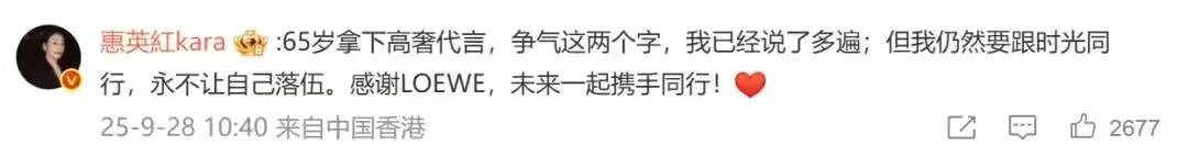 在品牌官宣微博下,惠英红亲自留下了一句回应:“65岁拿下高奢代言,‘争气’这两个字,我已经说过很多遍。”短短数十字,却掷地有声。
