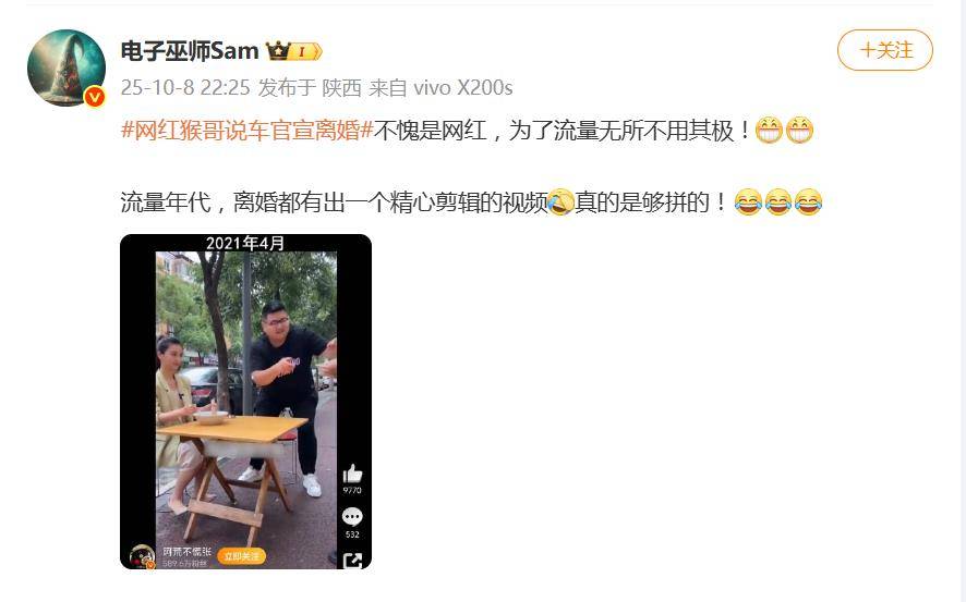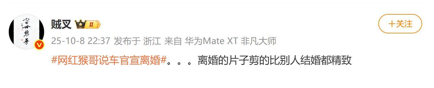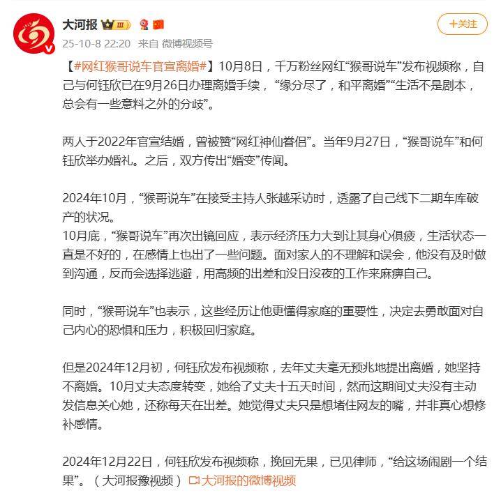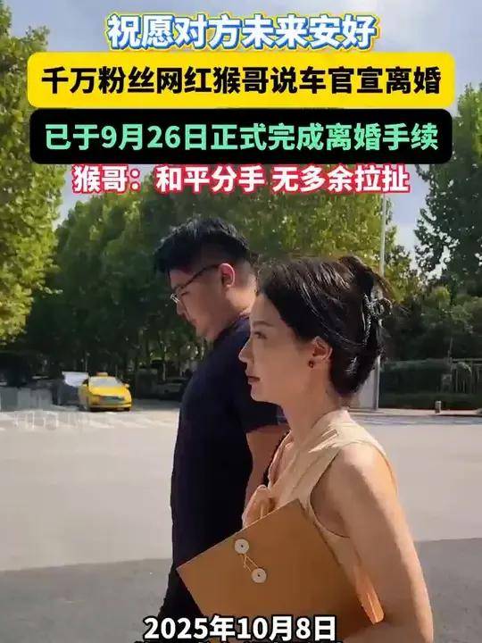 10月8日,坐拥千万粉丝的汽车博主“猴哥说车”一纸官宣,让“网红神仙眷侣”的童话彻底破灭。他在视频中坦言,已与妻子何钰欣于9月26日在南京办理离婚手续,称“缘分尽了,和平离婚”,并留下一句耐人寻味的感慨:“生活不是剧本,总会有一些意料之外的分歧。”