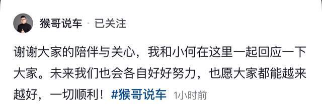 猴哥说车与何钰欣分别在视频账号上分享离婚文案:谢谢大家的陪伴与关心,我和小何在这里一起回应一下大家,未来我们也会各自好好努力。也愿大家都能越来越好,一切顺利。