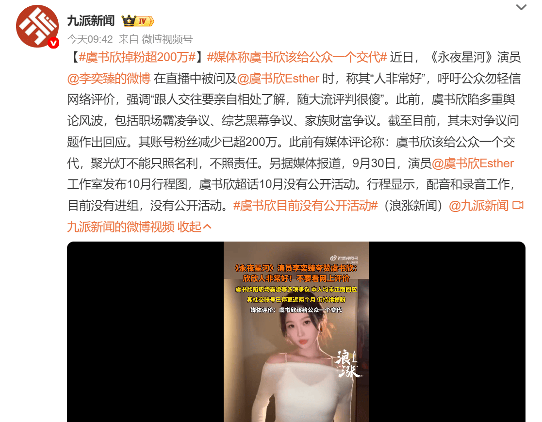 针对虞书欣方面的表现,多家权威媒体发文质问,如《长江日报社》旗下的“九派新闻”报道称“此前,虞书欣陷多重舆论风波,包括职场霸凌争议、综艺黑幕争议、家族财富争议。截至目前,其未对争议问题做出回应。”