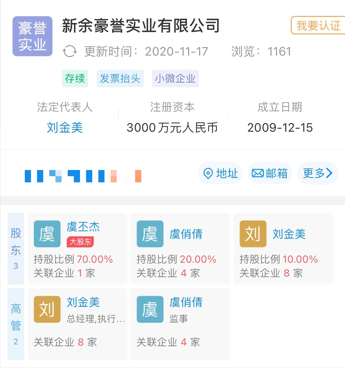 而卷入案件的新余豪誉实业,看上去更像是虞书欣家的“家族企业”,她的父亲虞丕杰持股70%,母亲刘金梅持股10%,另外20%从虞俏倩,是虞丕杰的妹妹,也就是虞书欣的姑姑。