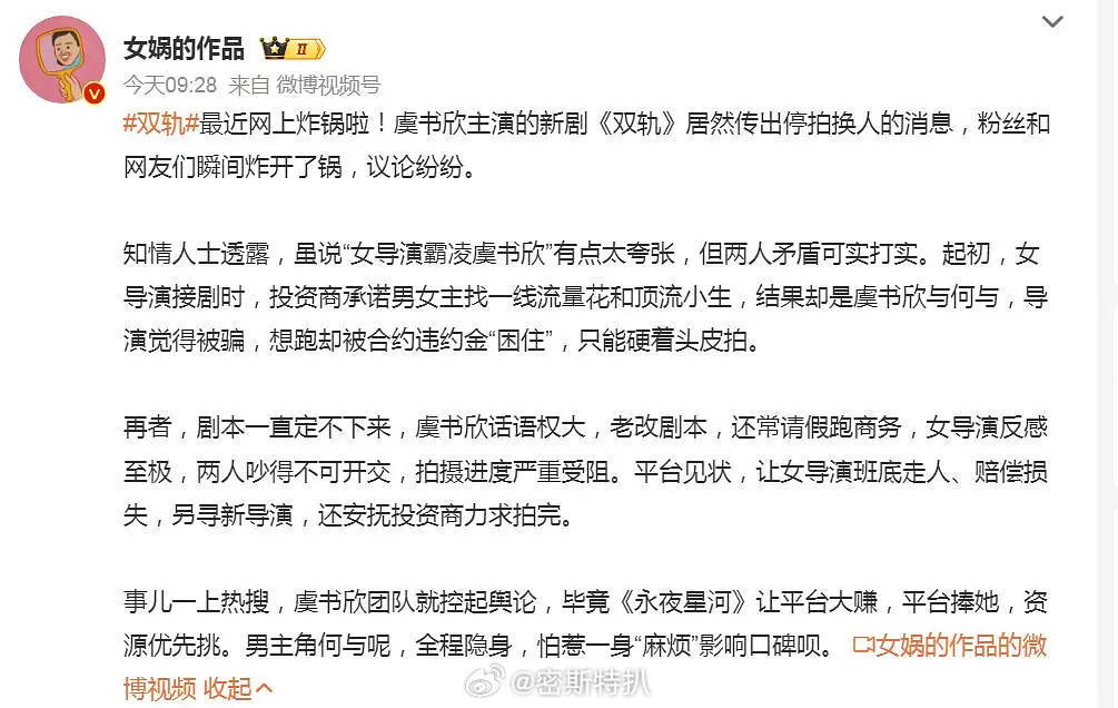 当时就有大V爆料称,《双轨》原定的是女导演,和虞书欣有不可调和的矛盾,两个人吵的不可开交,拍摄也严重受阻,平台不得已之下让女导演班底走人,并另寻新导演。